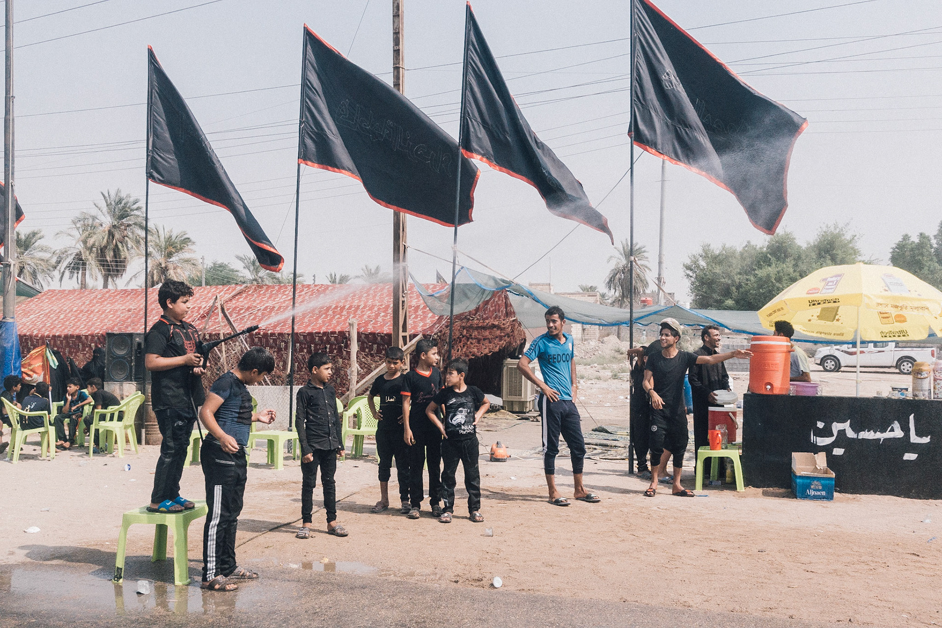 Young boys with water hose to keep pilgrims cool during a hot day