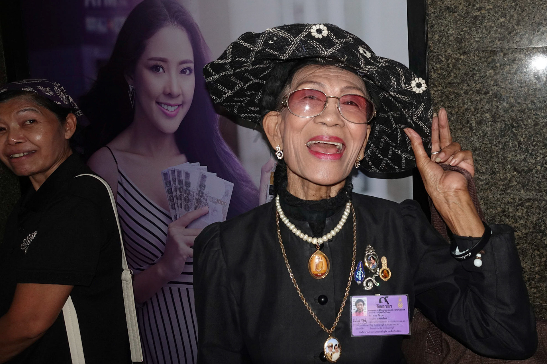 (ขวา) คุณยายกับหมวกเก๋ๆ มาเป็นอาสาสมัครงานพระราชพิธีเสด็จสู่สวรรคาลัย ร.9
