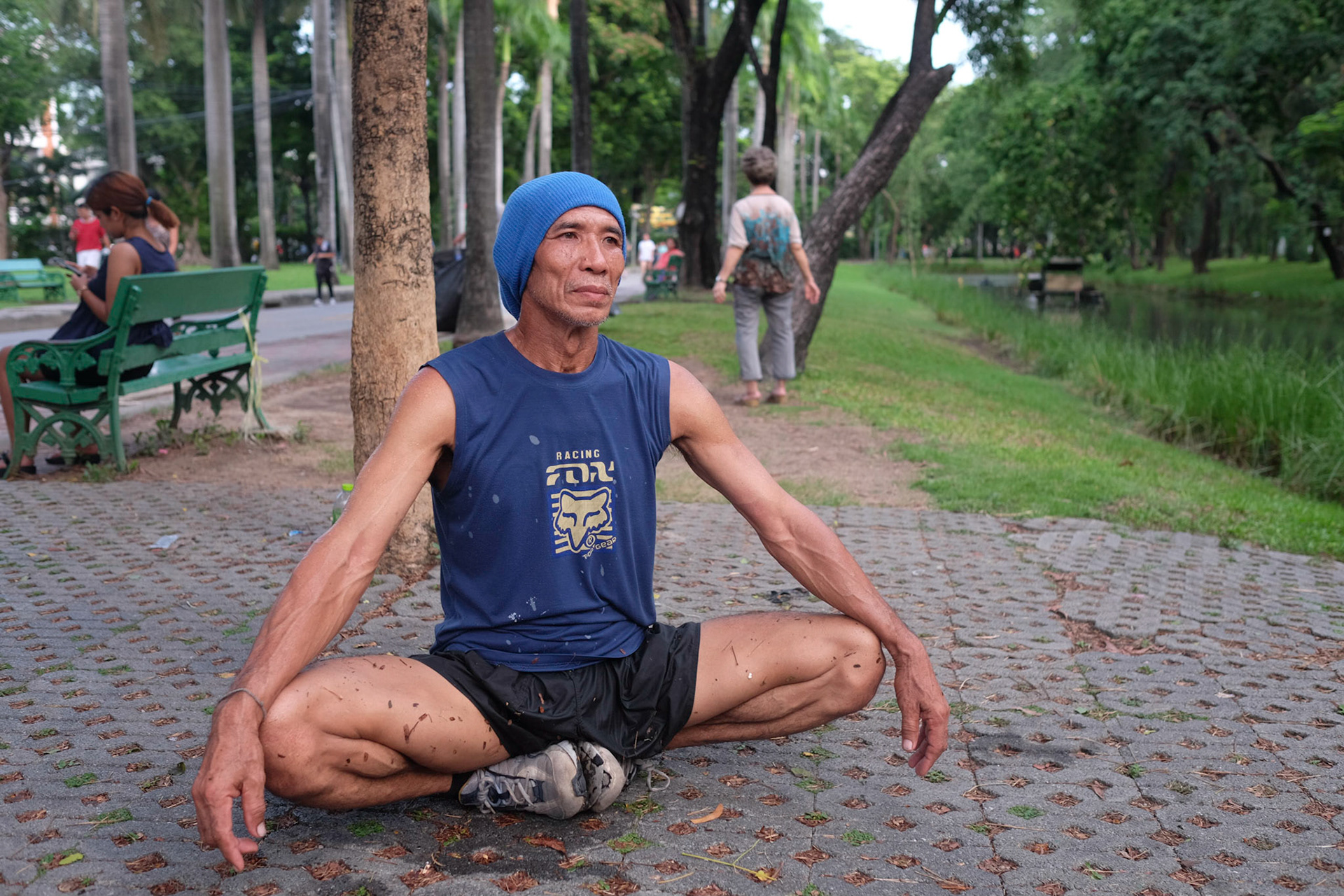 This is P'Suwan. He may be pushing 60, but he is still extremely fit. He's been running at Lumpini Park almost everyday over the past 10 years. He caught my attention with his rather unusual stretching routine. You have got to see how flexible his body is. It's almost like a yoga pose for some of stretching he did. I was not even sure it's safe to stretch his legs like that.