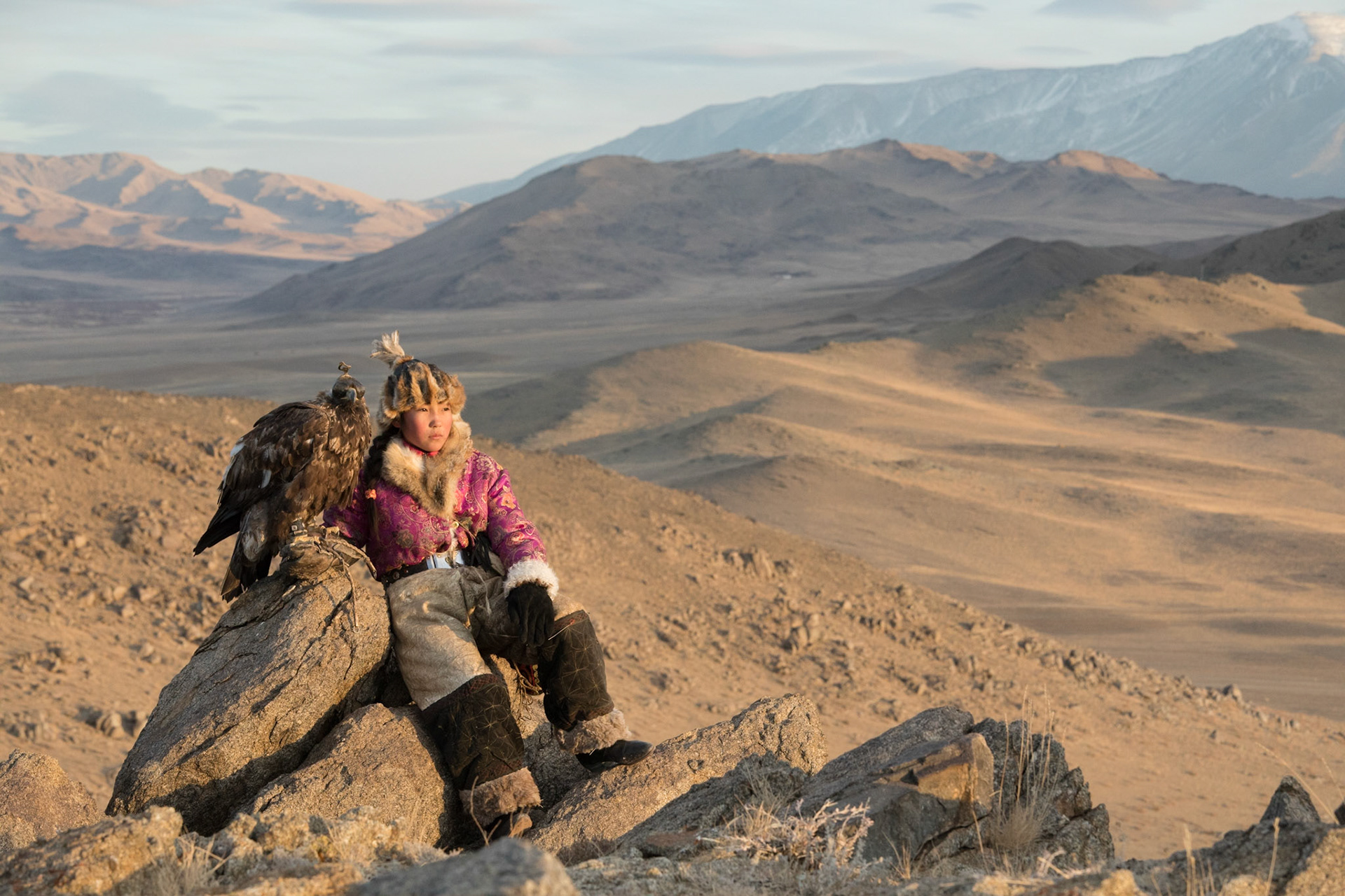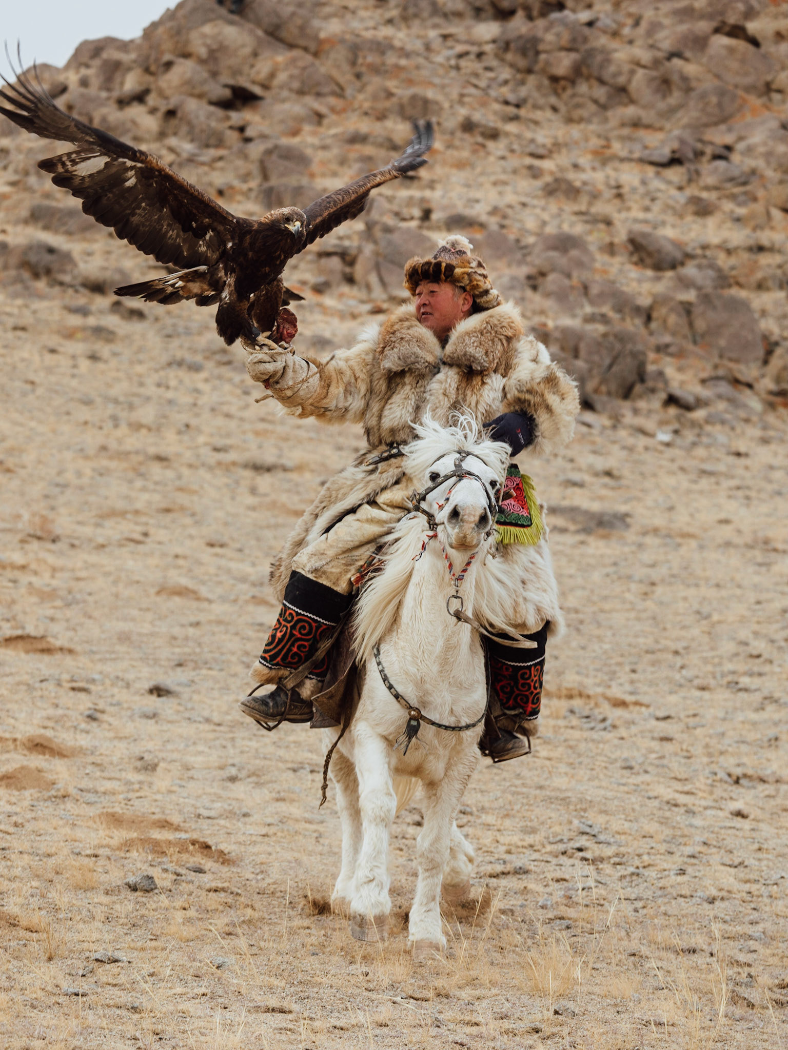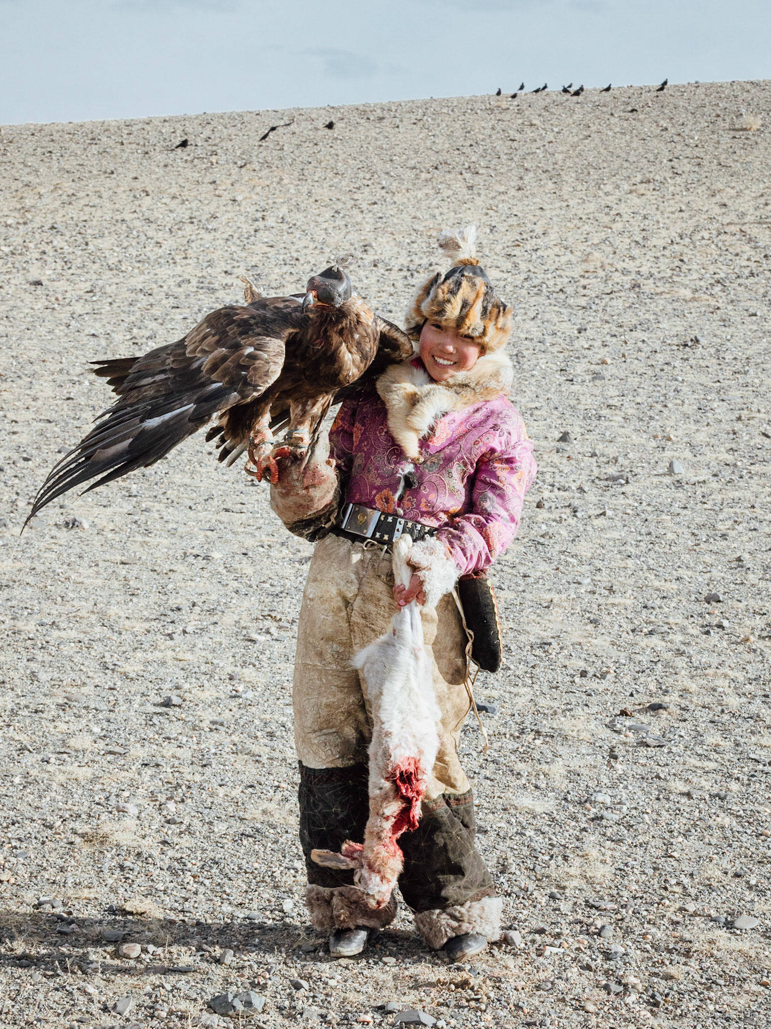 We met a young girl named Zamanbol who aspires to be the next eagle huntress. Perhaps she was just shy in the presence of strangers, but she had a quiet demeanor. I could see a hint of sadness in her eyes. It made me wonder whether this was where she really wanted to be. On our last day with the eagle hunters, however, we had a chance to observe how a golden eagle was trained. That was the first time I saw Zamanbol’s genuine smile. I could finally see that she loved to be out there with her golden eagle.